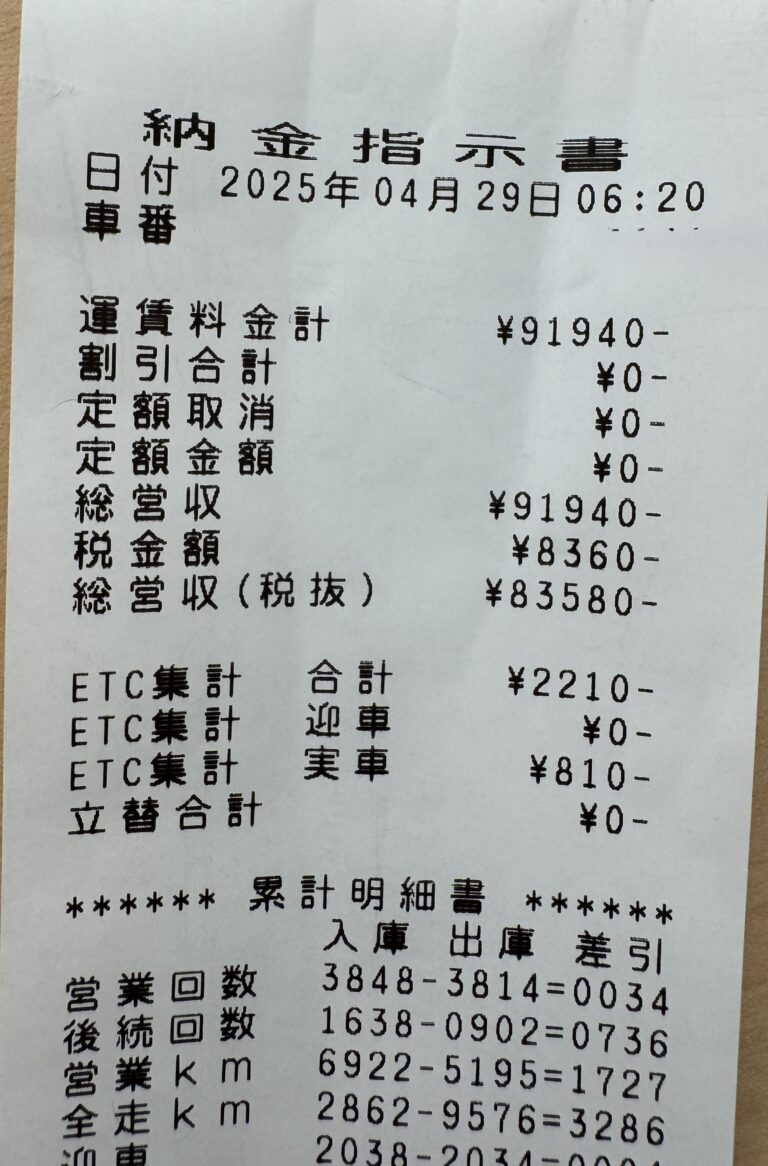 最後にロング引きたかったですが、500円のワンメで終了。回送で帰庫しました。